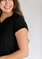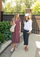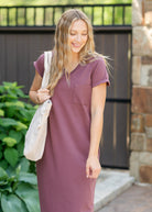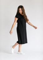 The Finley V-Neck T-Shirt Midi Dress is an Inherit Design made with soft cotton and a touch of spandex for breathable stretch. Rolled sleeves, a front chest pocket, and hidden side pockets offer everyday ease. With a modest v-neckline and no slit, this comfy, flattering dress is perfect for errands, relaxing, or pairing with sneakers!