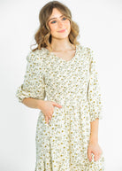 The Flora 3/4 Puff Sleeve Smocked Midi Dress is an Inherit Design that is perfect for any occasion! This dress features a modest v-neck, 3/4 puff sleeves, and a smocked bodice for a flattering and comfortable fit. The allover floral pattern adds a touch of ethereal elegance, making this dress perfect for a family photos, church, or any other special event. The midi length makes it versatile and suitable for a variety of body types, with plus sizes available. This beautiful feminine dress is a must-have for any wardrobe!