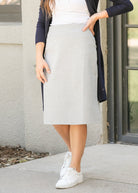 The Quinn Midi Skirt is your go-to modest skirt for travel, work, church, and everyday wear. Designed with a slimming, supportive stretch waistband and no pockets for a sleek, no-bulk fit. Made from a wrinkle-resistant, stretchy fabric that flatters all body types. A comfortable, versatile midi skirt perfect for your 9-5 or weekend plans.