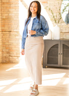 The Stella Simply Taupe Denim Maxi Skirt is the ultimate blend of classic modest style and everyday comfort! An Inherit Design and a customer favorite, this modest maxi skirt is crafted for timeless wear. The structured denim fabric gives it a polished, put-together look, while the straight-fit silhouette ensures versatility for any occasion. Thoughtfully detailed, it features a silver button closure with the Inherit Badge Logo, functional pockets, and belt loops for added style options. The 14-inch back slit provides ease of movement, making it effortless to wear all day. Whether styled casually with a simple tee and sneakers or dressed up with a blouse and boots, this denim maxi skirt is a wardrobe staple you'll reach for again and again. Perfect for work, weekends, and everything in between, the Stella is a must-have for any modest fashion lover looking for a go-to denim piece that never goes out of style!