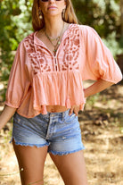 Coral Tie Front Embroidered Peplum Top - FINAL SALE